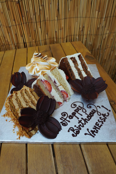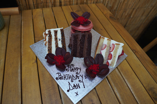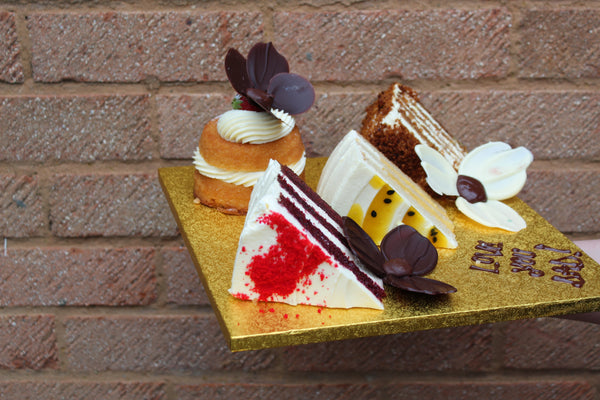 Can’t decide on just one cake? Our Celebration Platter Gift lets you mix and match up to four different flavours of your favourite Prestige Patisserie cakes or tarts—all beautifully presented on a handcrafted platter.