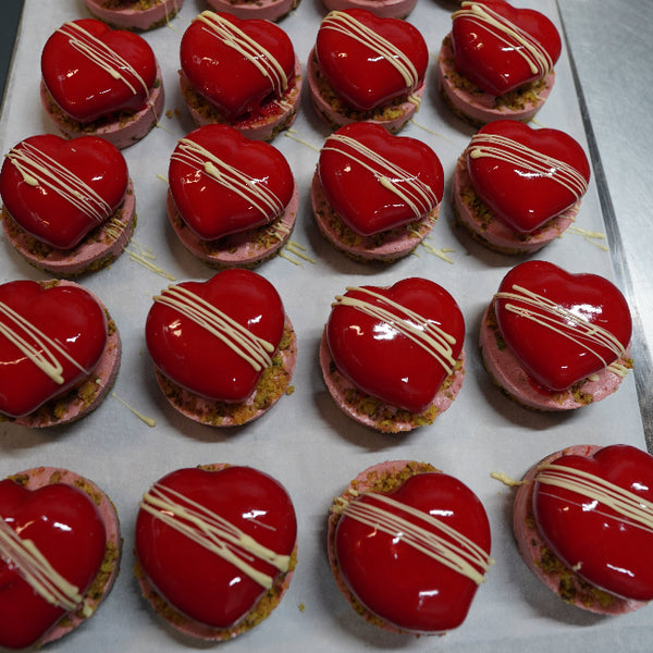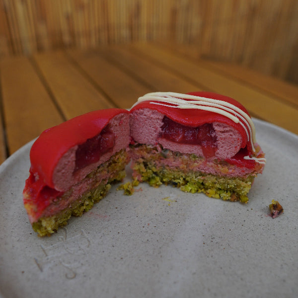 A light pistachio and olive oil sponge kissed with fresh lemon forms the base, topped with a velvety strawberry mousse heart filled with a hidden strawberry compote centre. Finished with a glossy mirror glaze for a truly refined presentation.